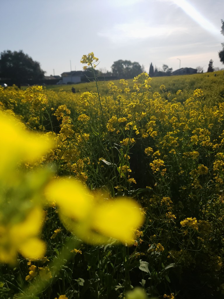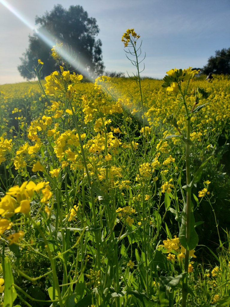 We drove to a small (not nearly as big as a Kansas wheatfield) mustard flower patch. These bright and yes, yellow flowers all blooming all at once is a gorgeous sight! Even though yellow is not my favorite color, these flowers are stunning! We waded into the flowers. Picture taking time had begun. We took pics of flowers and selfies and so many more things. Just an amazing time! But kneeling down in amongst the mustard flowers, I got some grass stains on the knees of my pants. These flowers had left their mark.