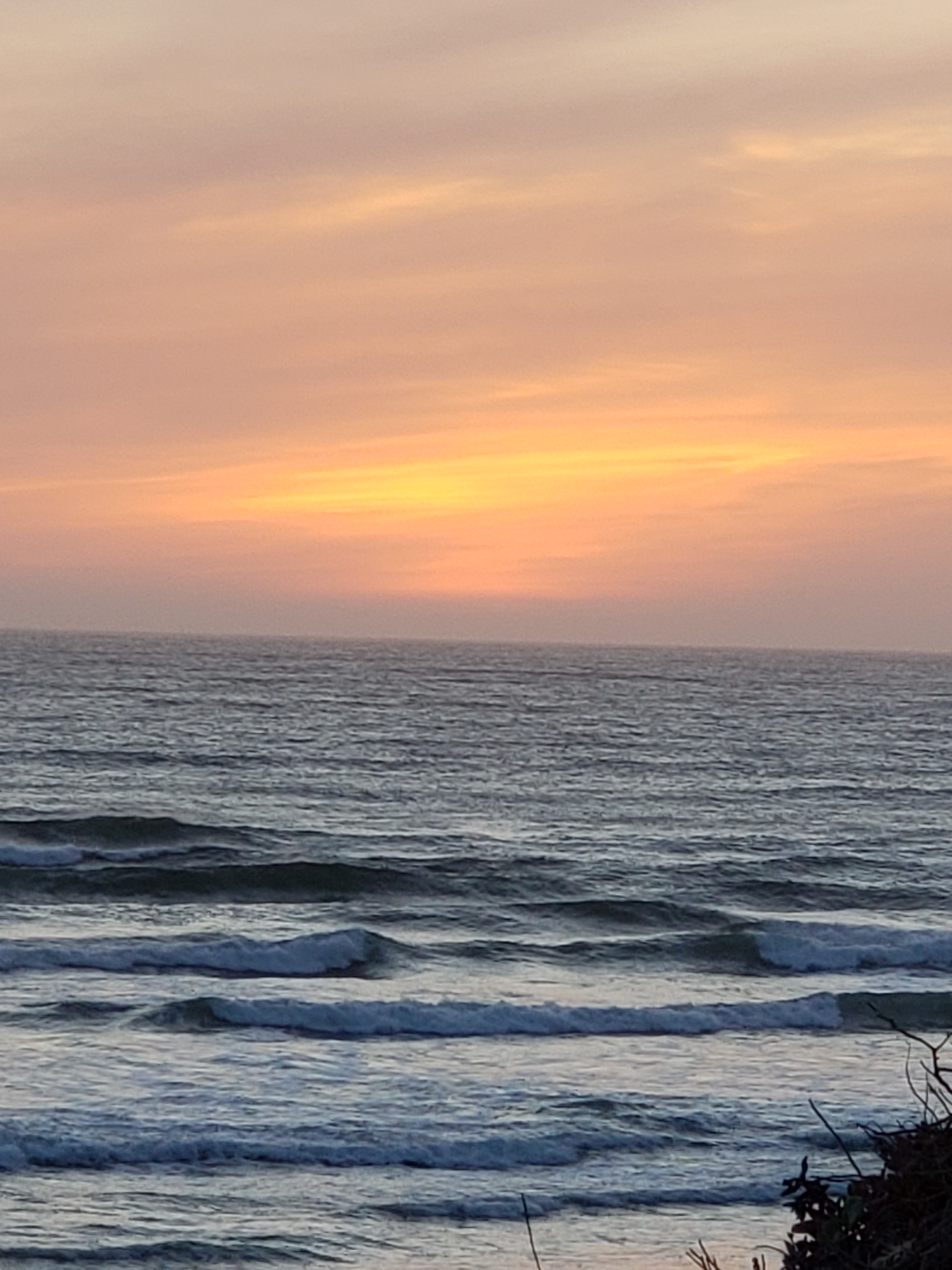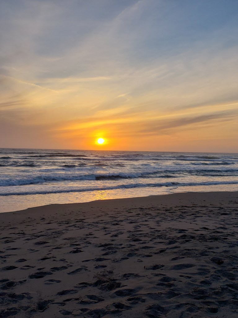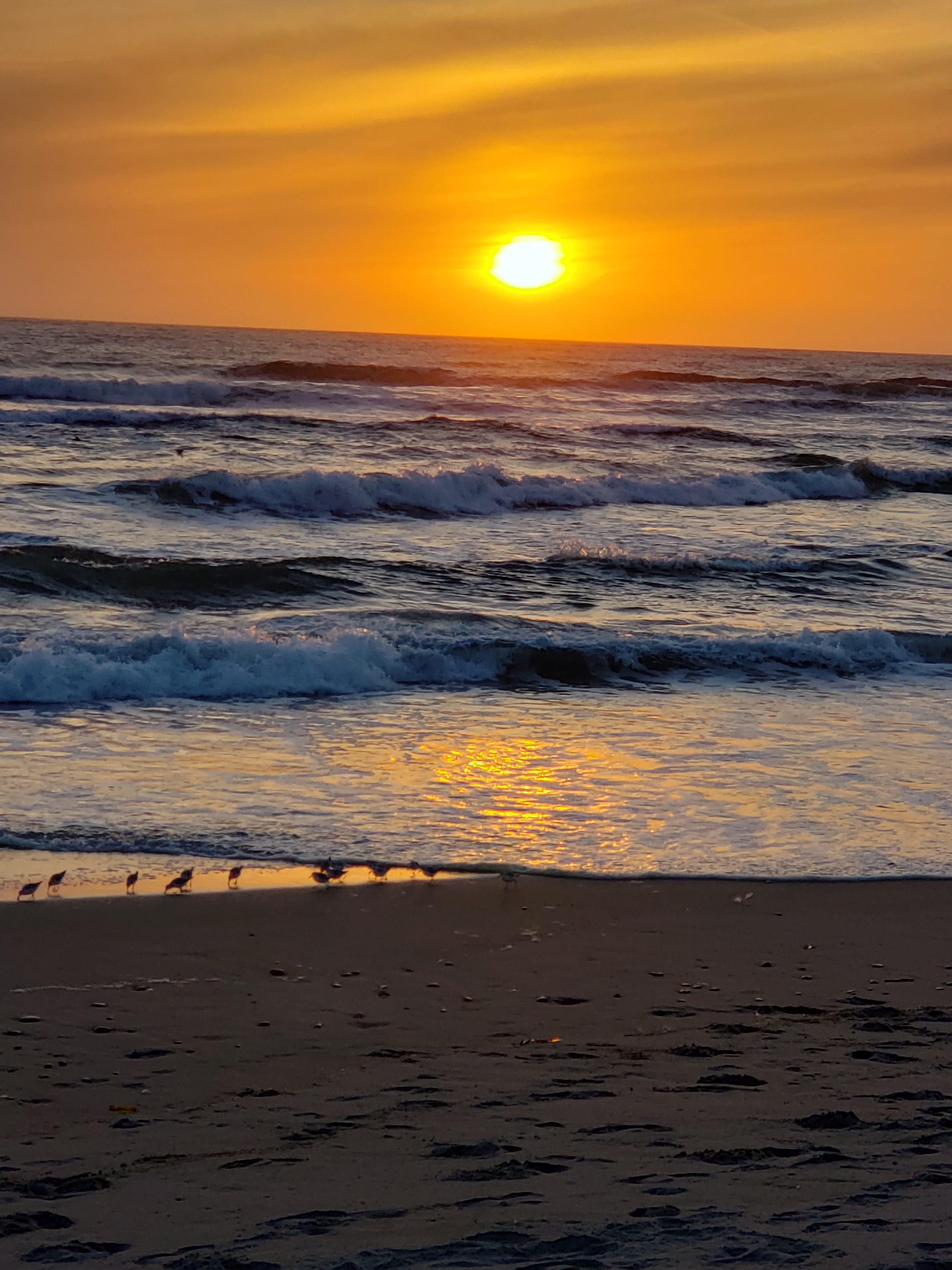 What does one write about when staring at the ocean? I see the waves rolling in, always different but always constant. I see the willets feeding as the waves roll out and running back out of the water as the waves roll in. I see a few seagulls flying overhead now and then too. I see a few other people, too. They run into the waves and you can hear the laughter as the waves break over them! They are just having fun! I see a few wispy clouds in the sky and know there will be better sunset colors because of them.