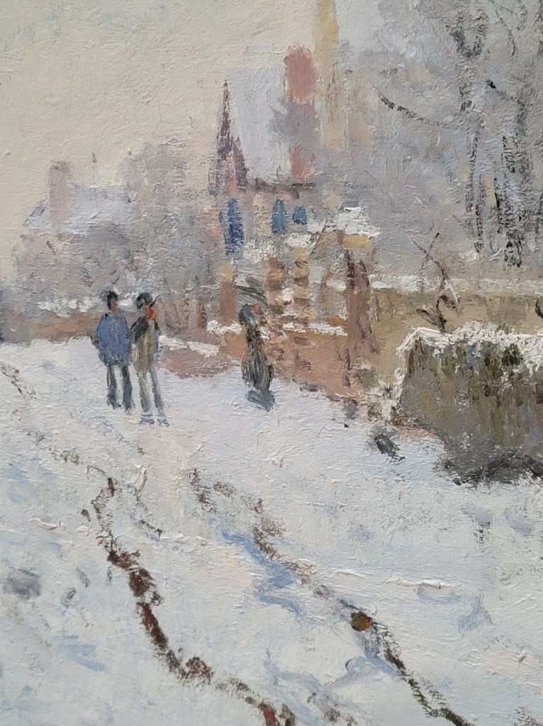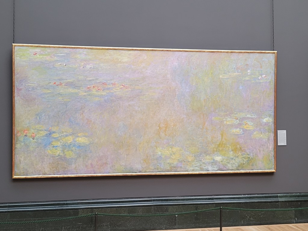 I found my favorite room. Renoir and Monet paintings and a couple of other artists I didn’t recognize. Monet had his own wall. You are seeing pics from this room in which I sit now. But something else grabbed my attention. A man was sitting on a bench staring at the Monet painting, Water Lilies, Setting Sun. But he wasn’t just staring at it. He had his art pad and his chalks out and he was copying it.