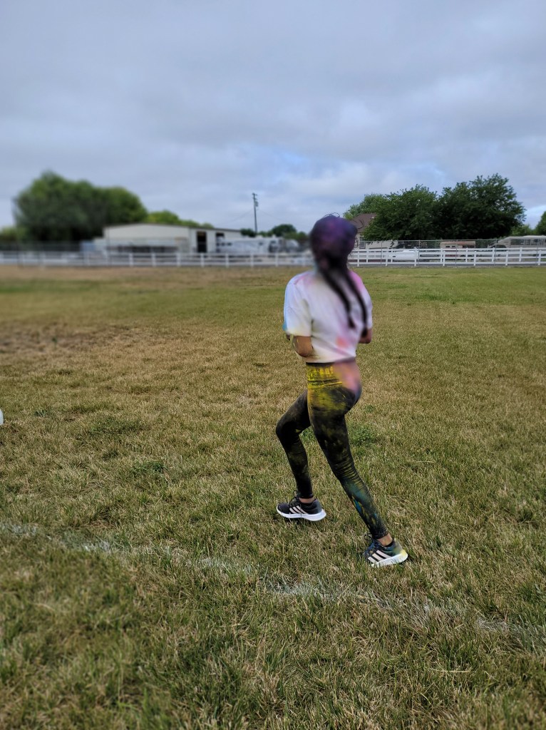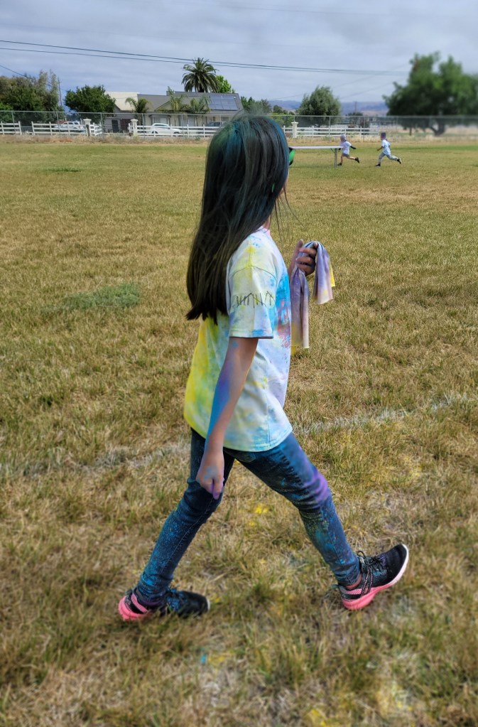 Meanwhile, the students had been donning their colorful outfits. A white T-shirt with the Color Run logo and colorful hats and tutus and neck gaiters. Now the race can begin! The school gave a first, second and third place prize for most laps in the following groups: K-2, 3-5, and 6-8. Each runner got a mark on their shirt every time they ran a lap.