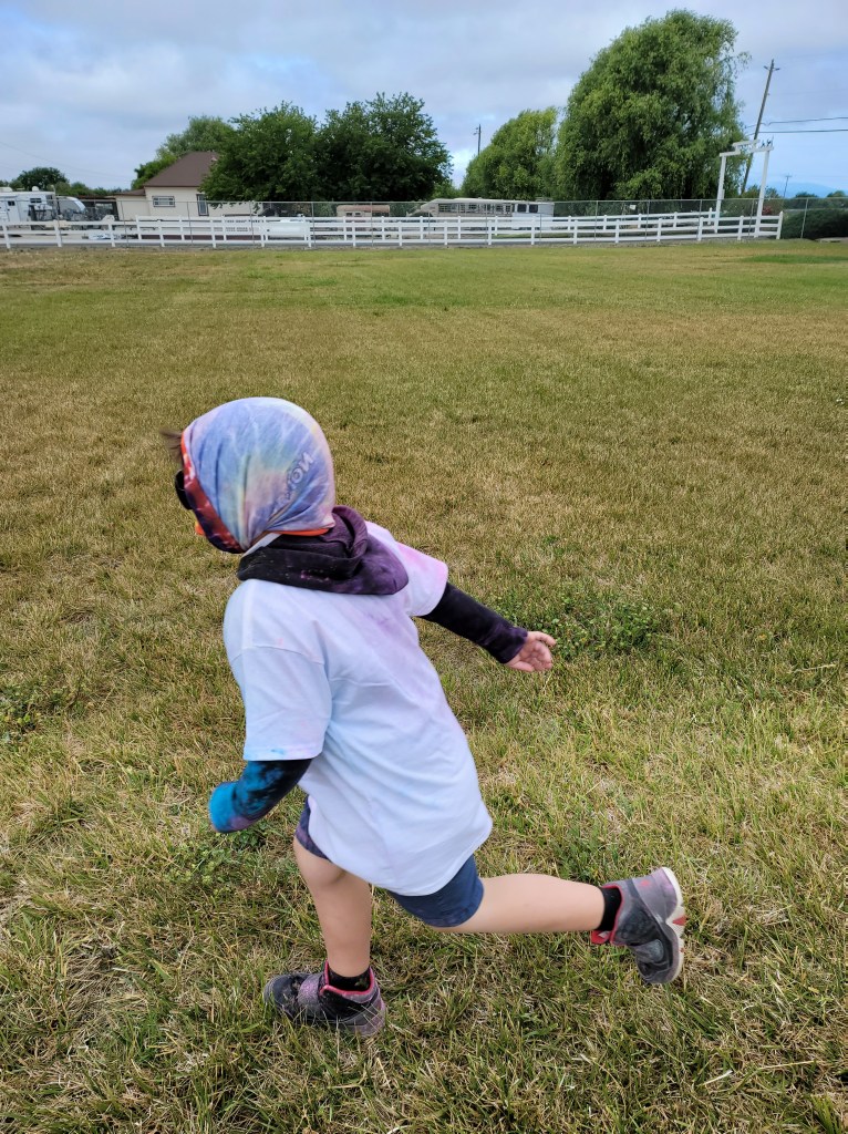 And they’re off! Jumping through the balloon hoop first and then around for their first lap. As students run by each table, volunteers are armed with paper cups of colored chalk dust. Then the volunteers get to throw the chalk dust into the air just as a student runner goes through the colorful cloud! Students got colorized at 4 different stations around the track. But run they did! And they had fun doing it. Some were covered from head to toe in various colors. I wasn’t sure who a couple of students were with so much color ending up on them. It was a grand time though!