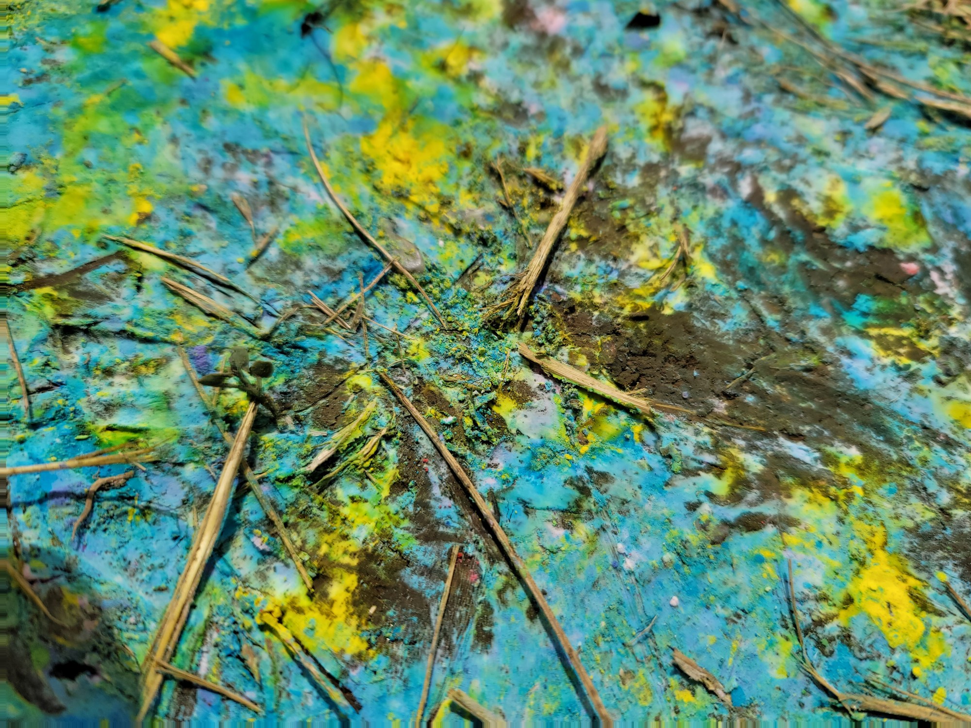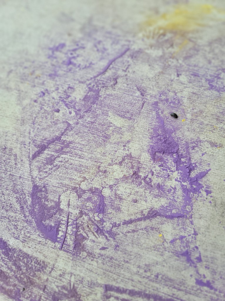 My job was to take pictures for the event. I have the students lined up to start and a picture of all the moms taking that same picture! As I wandered around looking for other shots to take, I noticed some spilled color on the cement. Some footprints had gove through it and left their marks. Those are the pictures with all the purple in it. And in the field there was a bare spot that collected lots of color. Those will be turned into my art and you see them in this blog.