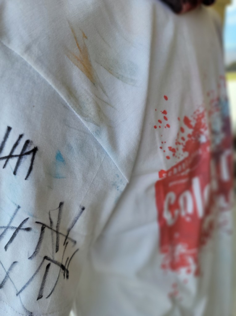 A Color Run is a fun but messy event. Students run around a track and volunteers throw colored chalk dust at the runners. The big day arrived! I spray painted a track onto the field behind the school. Many volunteers came to help. Tables were set up inside the track. The bags colored chalk dust were placed on each table. The balloon hoop was ready for runners to jump through at the start. Everything was finally ready!